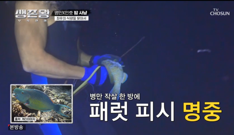 이제 질세라 정글신 김병만은 산호 밑에서 자고 있던