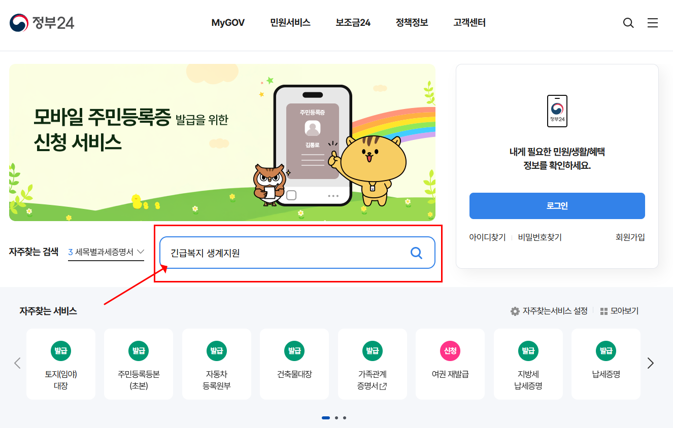 긴급복지 생계지원은 정부24나 복지로를 통한 온라인 신청이 지원되지 않습니다.